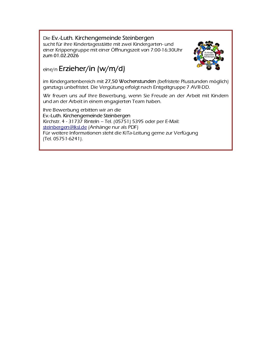 19. Januar 202619. Januar 2026Alle, Ankündigungen, Kinder und Jugend, Kita Steinbergen Stellenanzeige Die Ev.-Luth. Kirchengemeinde Steinbergen sucht für ihre Kindertagesstätte mit zwei Kindergarten- und einer Krippengruppe mit einer Öffnungszeit von 7:00-16:30Uhr zum 01.02.2026 eine/n […]